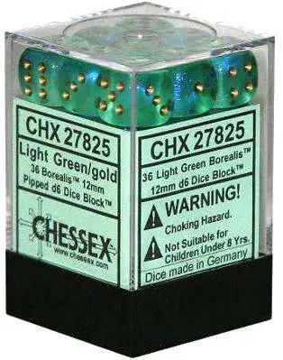 Pack of 36 count 12mm 6-sided d6 dice. Borealis Light Green with Gold [CHX27825]