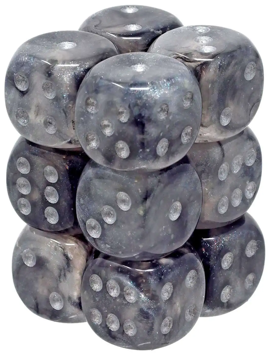 Pack of 12 count 16mm 6-sided d6 dice. Light Smoke with Silver [CHX27778]Luminary Effect Glows in the Dark.