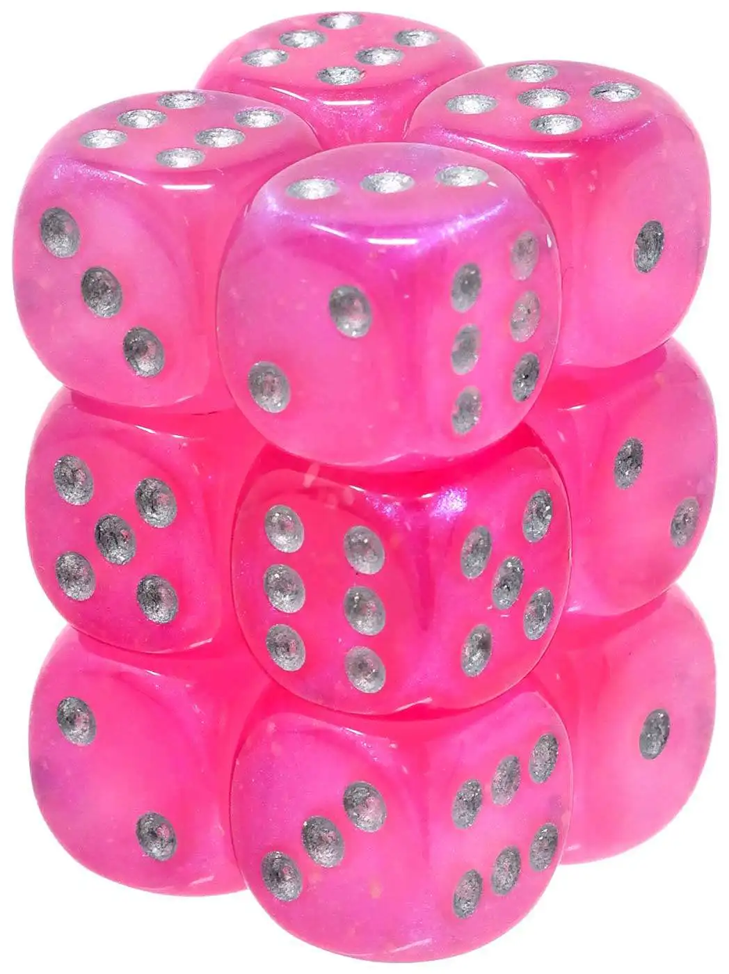 Pack of 12 count 16mm 6-sided d6 dice. Pink with Silver [CHX27784]Luminary Effect Glows in the Dark.