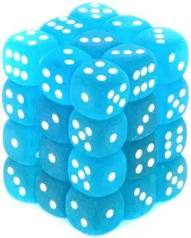 Pack of 36 count 12mm 6-sided d6 dice. Frosted Carribean Blue With White [CHX27816]