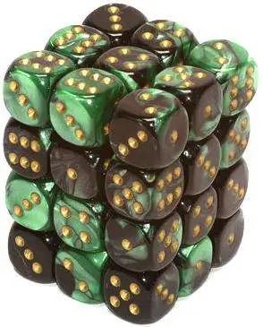 Pack of 36 count 12mm 6-sided d6 dice. Gemini Green with Gold [CHX26839]