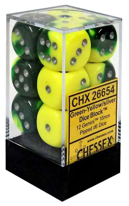 Pack of 12 count 16mm 6-sided d6 dice.Green-Yellow/Silver [CHX26654]