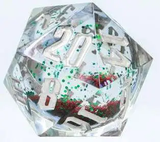 This festive 54mm Snowglobe d20 contains glitter and snowflakes that float when rolled.