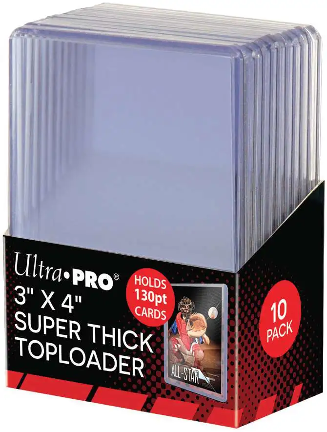Super clear, 3″ x 4″ Super Thick Toploader for standard sized cards. Holds cards up to 130pt thickness. Rigid plastic encloses card and keeps it clean while preventing damage. 10 Toploaders per pack.