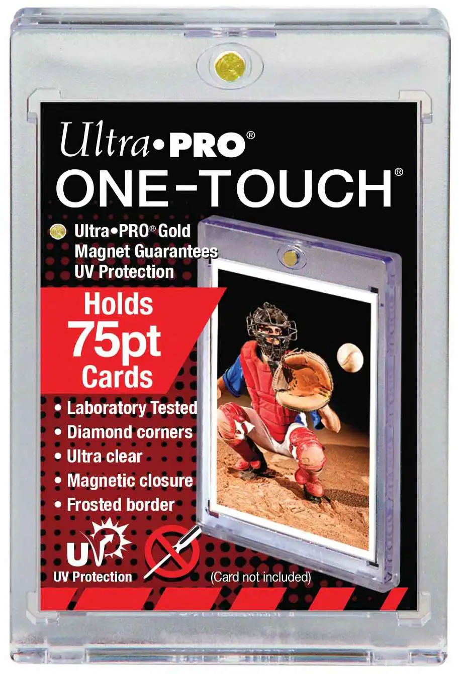 Ultra PRO’s ONE-TOUCH holders are premium trading card storage cases designed as the final destination for your collectible trading cards. The two-piece ONE-TOUCH holders are uniquely designed with slide-in hinges and magnetic closure so you’ll never have to use a screwdriver again. The holder uses UV-blocking additives to protect your card from harmful UV-rays, and is made with non-PVC materials to provide acid-free protection – ensuring your valuable hit retains its condition while under display. Our ONE-TOUCH holders are ideal for presenting prized and super rare gaming cards as well. This model can hold standard cards (2-1/2″ X 3-1/2″) up to 75pt in thickness.