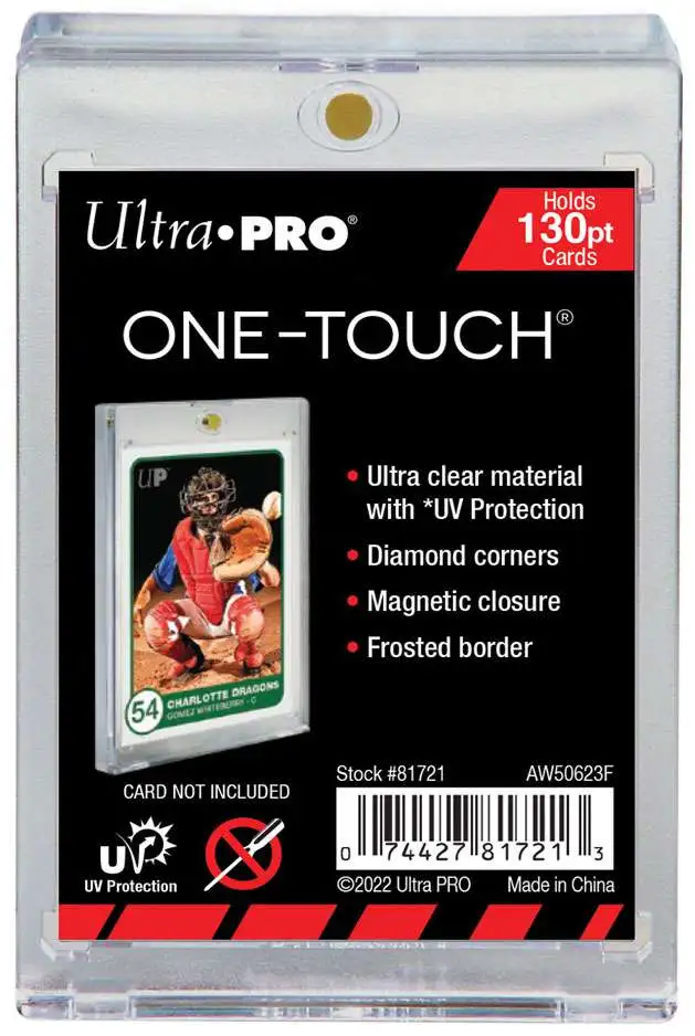 Ultra PRO’s ONE-TOUCH holders are premium trading card storage cases designed as the final destination for your collectible trading cards. The two-piece ONE-TOUCH holders are uniquely designed with slide-in hinges and magnetic closure so you’ll never have to use a screwdriver again. The holder uses UV-blocking additives to protect your card from harmful UV-rays, and is made with non-PVC materials to provide acid-free protection – ensuring your valuable hit retains its condition while under display. Our ONE-TOUCH holders are ideal for presenting prized and super rare gaming cards as well. This model can hold standard cards (2-1/2″ X 3-1/2″) up to 130pt in thickness.