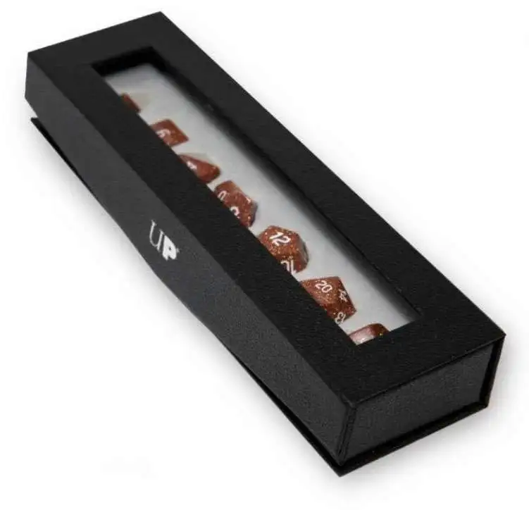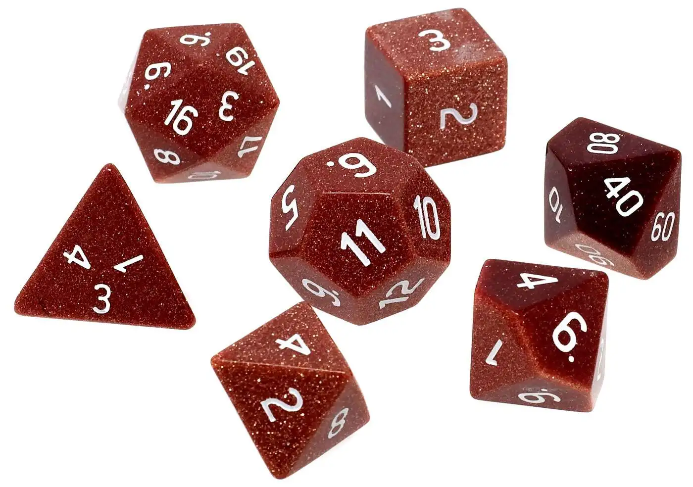 These dice cut of semi-precious stone are armory-approved. These semi-precious stones are individually hand cut, and the numbers are sand-blasted all by hand. Each set is distinctive, with no two sets being identical. Each set comes with the following polyhedral dice(D4, D6, D8, D10, D12, D20, and a Percentile Die).