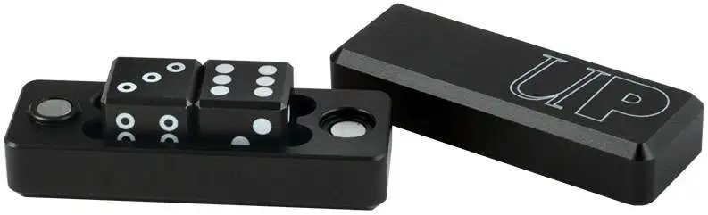 UP your game with Gravity Dice! We utilize the most advanced 3D modeling and simulation to bring you perfectly balanced dice. Through complex model algorithms we found a balance between great weight, center of gravity and exceptional style. Dice and holder are anodized, aircraft grade aluminum. Magnetic closure. Laser etched dots and logos. Dice size: 0.630″ (16.01mm). Holder Size 2.3″ x 0.9″ (58.4mm x 22.8mm). Style dice: 1 solid dot dice & 1 stroke dot dice.